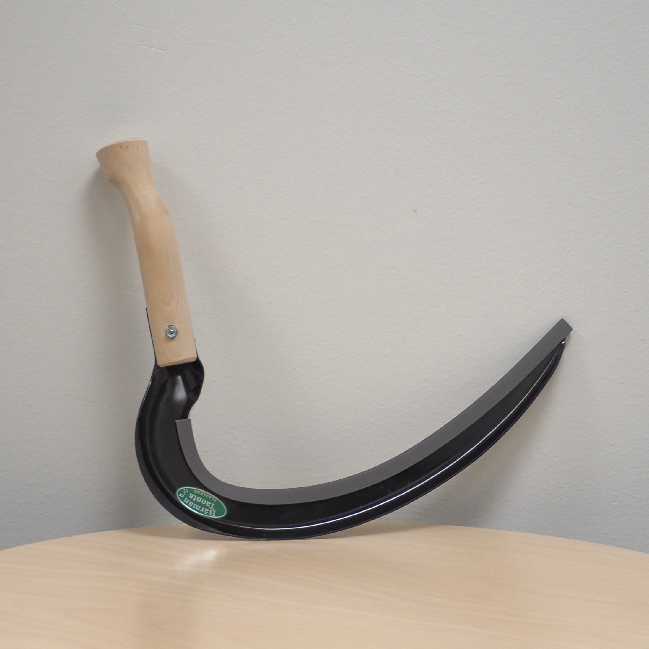 Kätevä metallinen sirppi puisella kädensijalla. Sopii esimerkiksi kukkapenkin ja pienempien alueiden siistimiseen.